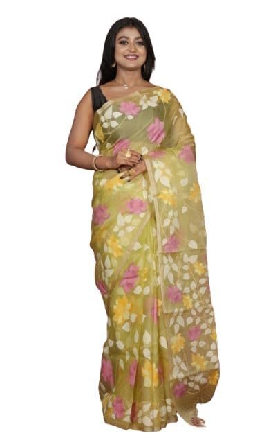 - Intricate Jangla Jaal Design: Features an exquisite Jangla Jaal weave pattern, enhanced with delicate lotus motifs, showcasing traditional Dhakai Jamdani craftsmanship.