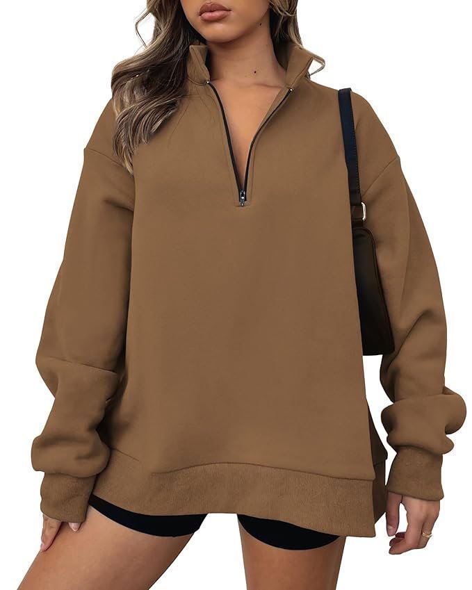 BTFBM Women’s Quarter Zip Long Sleeve Sweatshirt Oversized Casual 2023 Fall Winter Fashion Hoodies Pullover Y2K Clothes, Solid Brown, Small