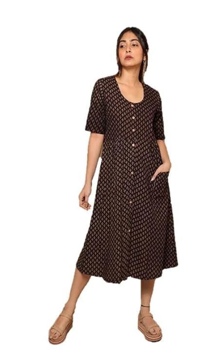 Gleamberry Women’s Black Ajrakh Cotton Dress Unique Design and Timeless Style for Every Occasion