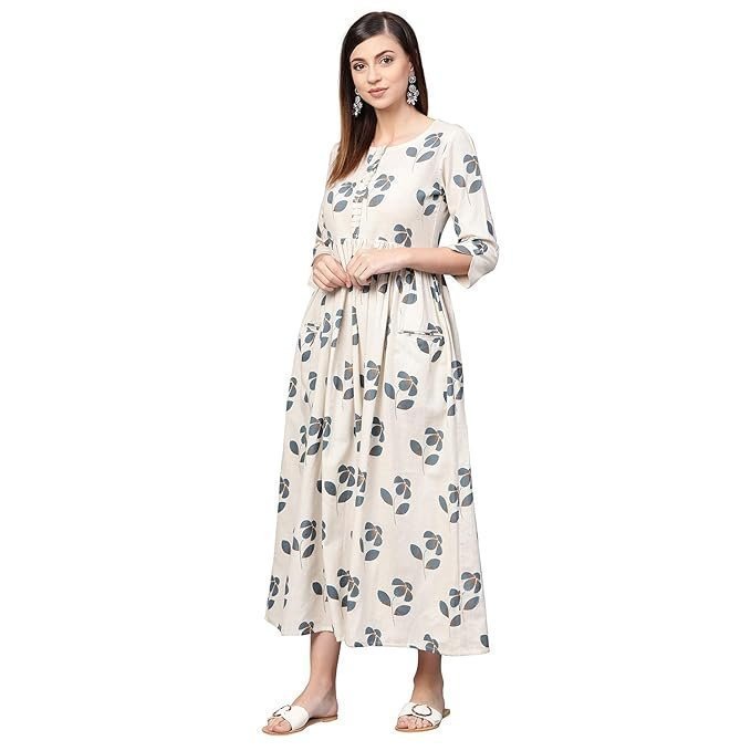 - Elegant Ethnic Wear – This Cream and Grey Floral Printed Cotton A-Line Dress with Pockets is a good addition to your ethnic wear wardrobe, blending style and comfort for a modern dress that’s great for formal occasions