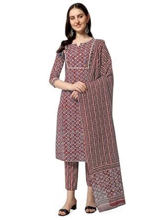MIRCHI FASHION Women’s Stylish Straight Fit Cotton Ajrak Motif Printed Kurta Set with Trouser Pant and Dupatta