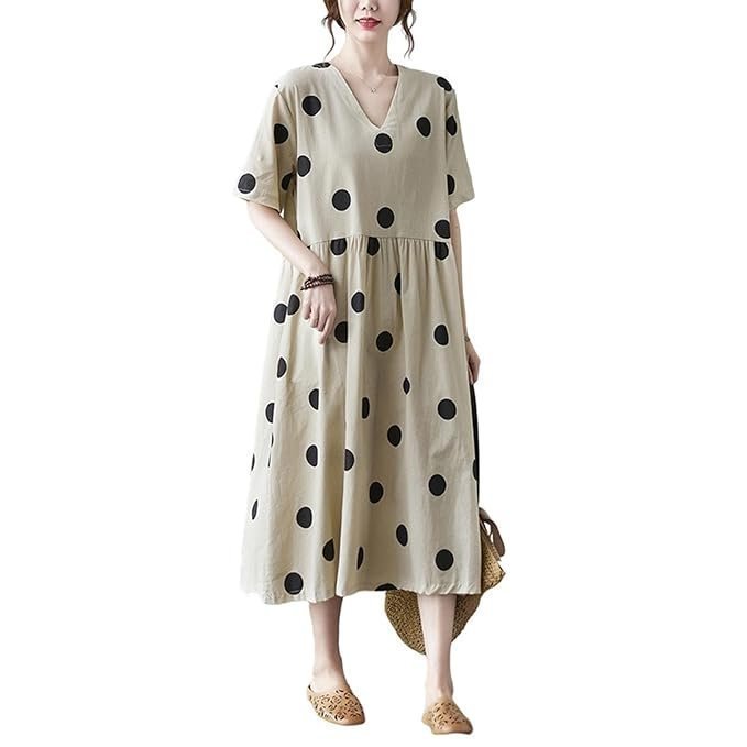 - Polka Dot Dress for Women Street Fashion Loose Panels Cotton Linen V-Neck Short Sleeve Dress