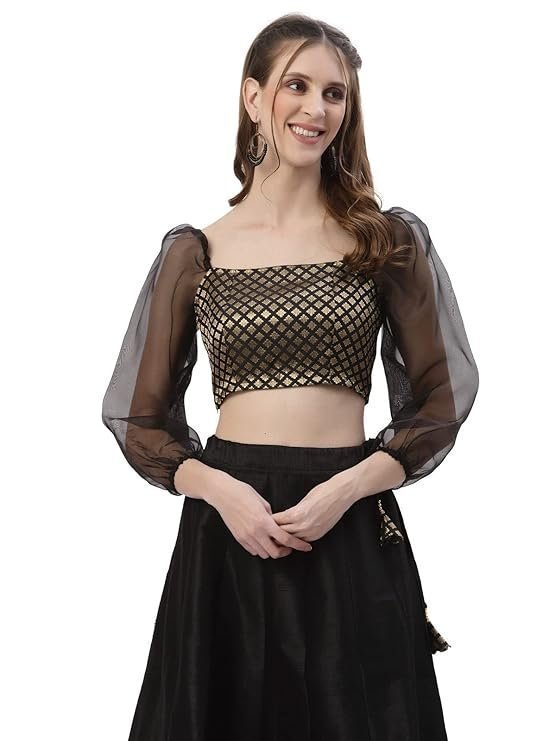 - We have given this traditional top a modern twist. The top features an elegant self woven brocade fabric body and elasticated sheer organza sleeves. Tailored for a comfortable fit, this crop top also comes with a side zipper.