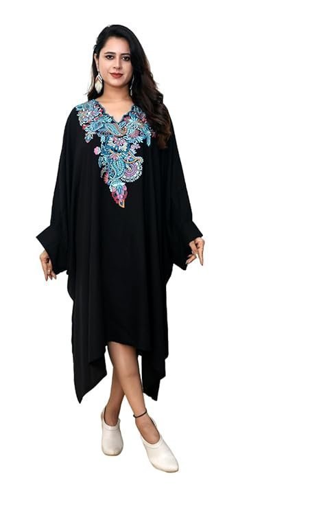 • Stylish Kaftan: A chic and comfortable kaftan dress featuring an intricate embroidered design on the neckline.