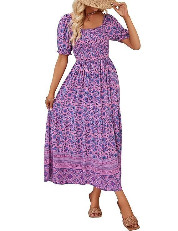- Women maxi dress,Fashionable elastic square neck design with special floral print, A line dress with cute elastic puff short sleeve, Beautiful Long dress with ruched bust and flowy hem. Which make you more feminine and charming.